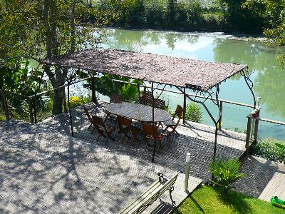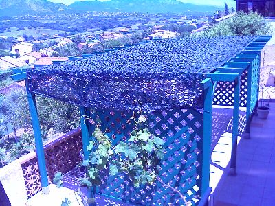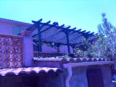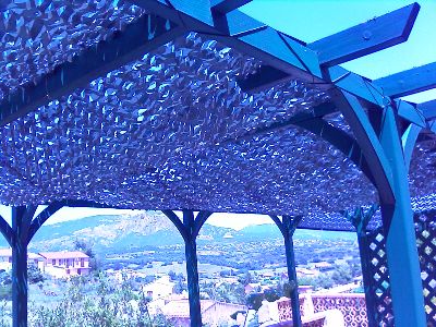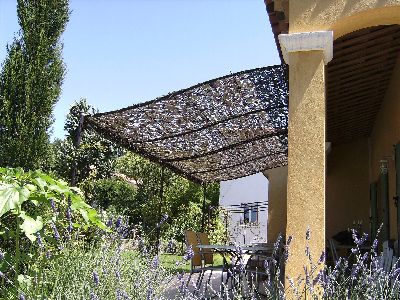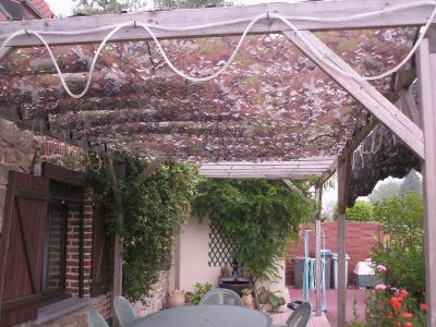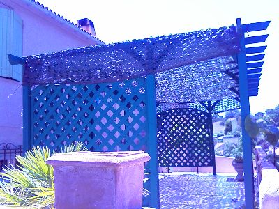 Filets U. S. Woodlands installés sur pergola pour ombrage côté gauche