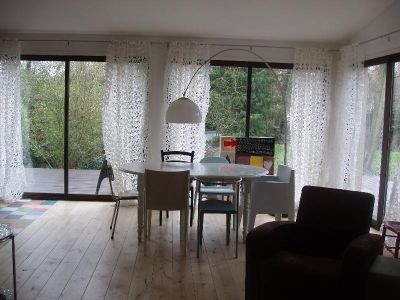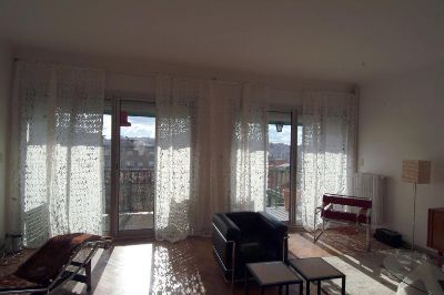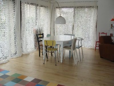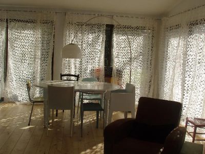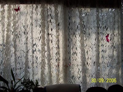 Filet 83309113 snow installé en tant que rideau, vu de l'intérieur. Commentaire de l'utilisateur: "chez  moi ca fait une ambiance cocon et ca agrandi la piece."