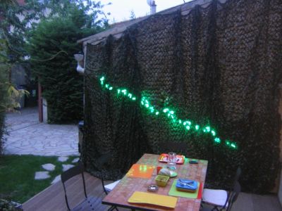 83309114 - Filet forest, vert olive, uni, comme camouflage d'une paroi, avec guirlande lumineuse.