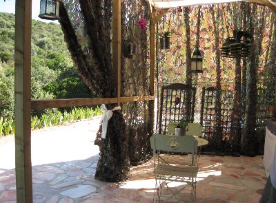Filets U. S. Woodlands installés sur pergola pour ombrage côté droit