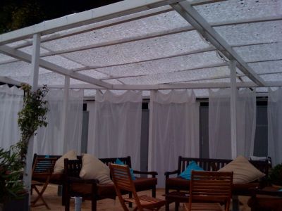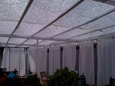 Filet snow installé en tant que rideau, vu de l'extérieur en soirée.Filet 83309113 snow installé en tant que rideau, vu de l'extérieur en soirée.