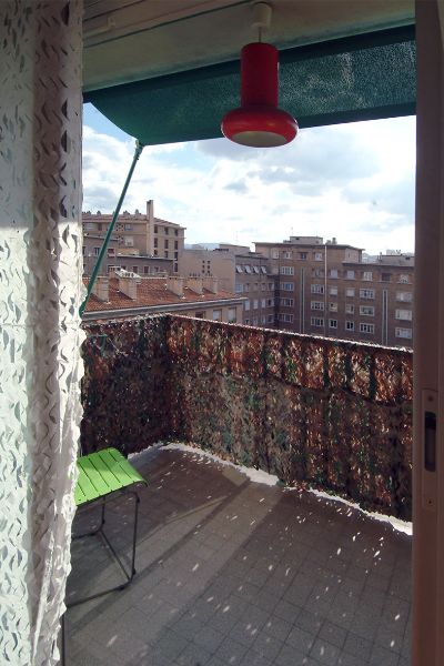 Filet 83309113 snow installé en tant que rideau, vu de l'intérieur avec soleil.